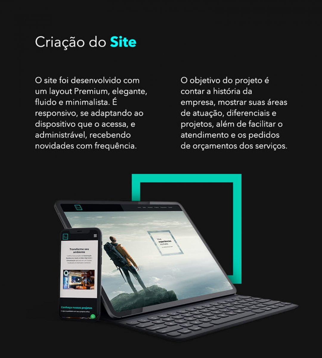 O site foi desenvolvido com um layout Premium, elegante, fluido e minimalista. É responsivo, se adaptando ao dispositivo que o acessa, e administrável, recebendo novidades com frequência.